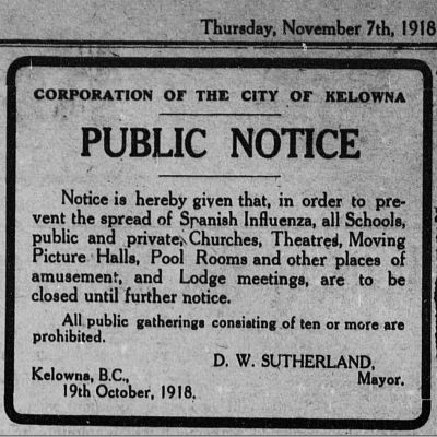 Some readers might remember the SARS outbreak of 2002. They may remember H1-N1 and various other outbreaks over the years. During the Spanish flu of 1918, all events in Kelowna with more than 10 people were cancelled.